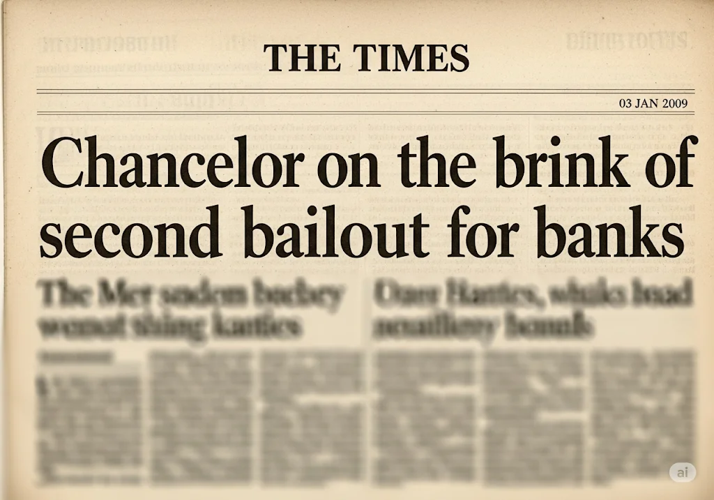 The network goes live. Satoshi mines the first block (Block #0), embedding a headline about bank bailouts.